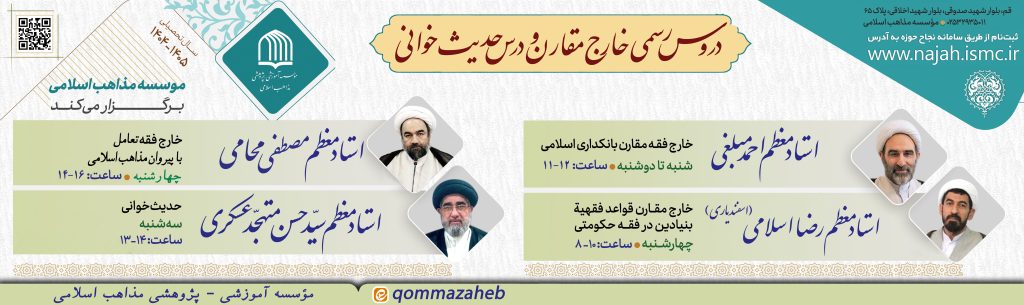 دروس رسمی خارج مقارن و حدیث خوانی استاد معظم احمد مبلغی استاد معظم رضا اسلامی (اسفندیاری) استاد معظم مصطفی محامی استاد معظم آل مجدد شیرازی (سید حسن متهجد عسکری) انتخاب درس از طریق سامانه نجاح حوزه به آدرس: www.najah.ismc.ir آدرس مؤسسه قم، بلوار شهید صدوقی، بلوار شهید اخلاقی، پلاک ۶۵ مؤسسه مذاهب اسلامی