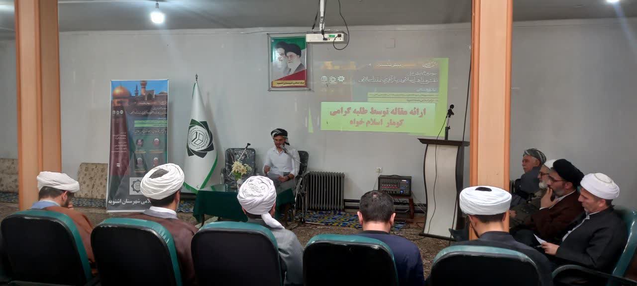 این نشست با حضور اساتید و طلاب علوم دینی شهرستان اشنویه برگزار گردید و در آن، ارائهدهندگان مقالات پذیرفتهشده به تحلیل نتایج پژوهشهای خود پرداختند. همچنین مقالات ارائهشده توسط داور منتخب مورد ارزیابی قرار گرفت.